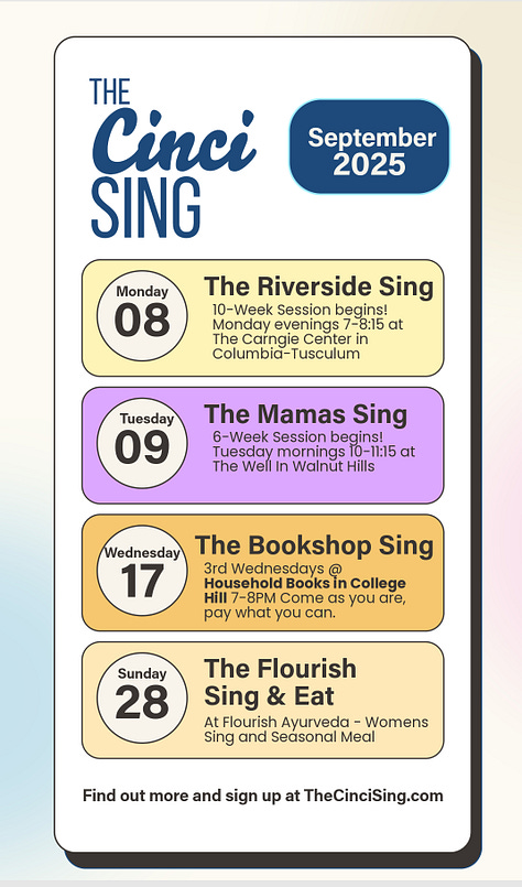 Singing in community has always been my greatest joy and I want to share it with you. The place to sign up is at TheCinciSing.com.