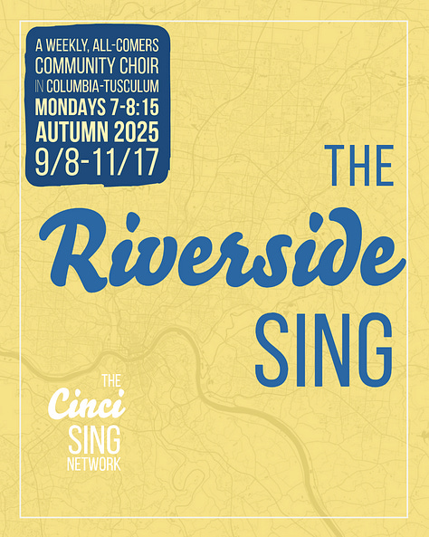 To join the 10-week session of the Riverside Sing starting Monday, September 8th, for $149 - go to https://thecincising.com/theriversidesing
